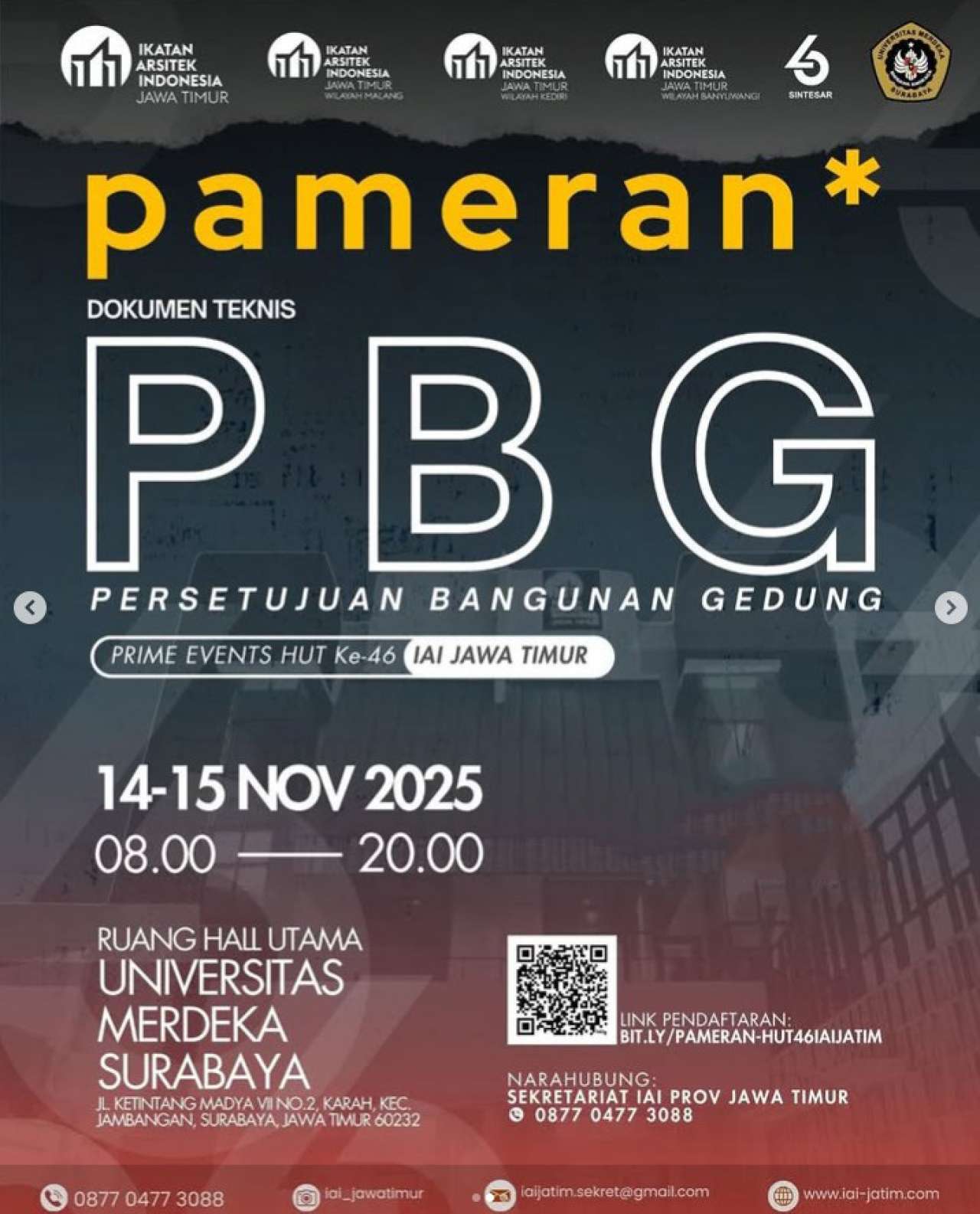 Sebagai salah satu dari rangkaian kegiatan HUT ke-46 IAI Jawa Timur, hadir 3 kegiatan pameran yang menjadi bagian dari Prime Events SINTESAR — ruang apresiasi, kolaborasi, dan inovasi bagi arsitek serta pelaku industri arsitektur di Jawa Timur.